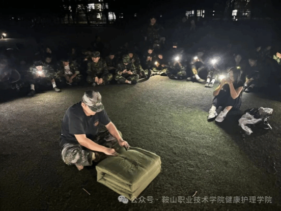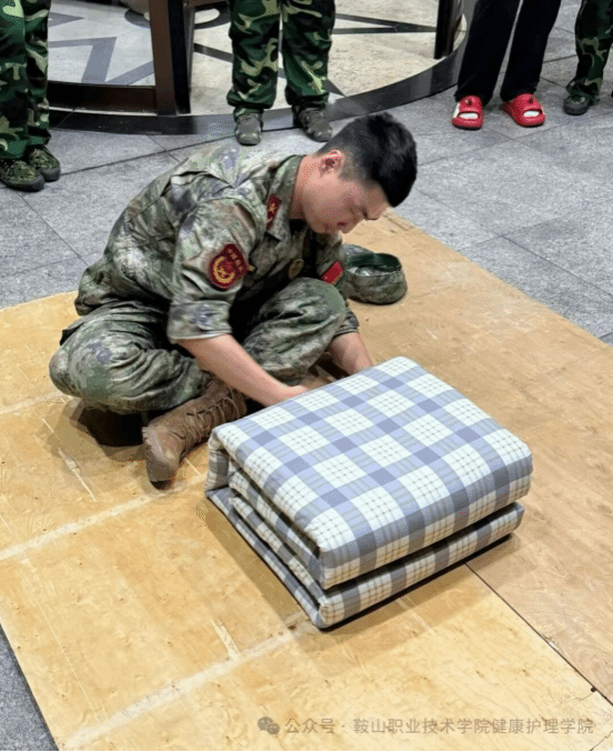 教官正在教学生叠军被,他先用力把被子压平,边压边说:“压不实,被子就没型。”接着用手量好尺寸,手掌肉厚处切出折痕,“切印得用掌,手指可不成。”随后熟练折叠、塞实、抠角。学生们听的全神贯注,在教官指导下,“豆腐块”逐渐成型。